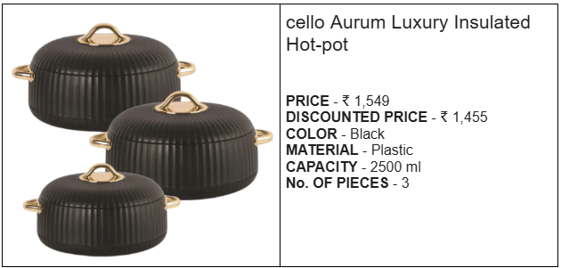 cello Midas (500+1000+1500) Pack of 3 Thermoware Casserole Set | ₹ 1,440 | ₹ 829 | 42% OFF |