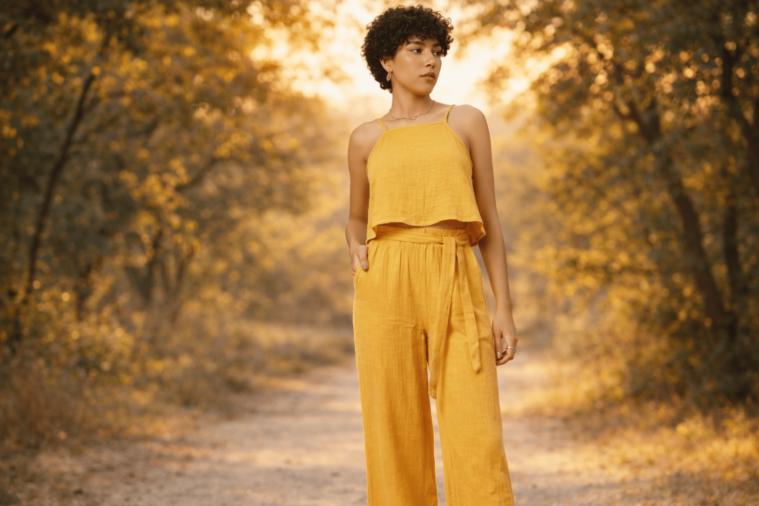 The 2-piece set has a casual and Valentine vibe. The yellow-colored co-ord set is instantly eye-catching with yellow trousers and a cami co-ord top with shoulder straps made with pure cotton. Styling it can be effortless with a sneaker and minimal makeup and jewellery.