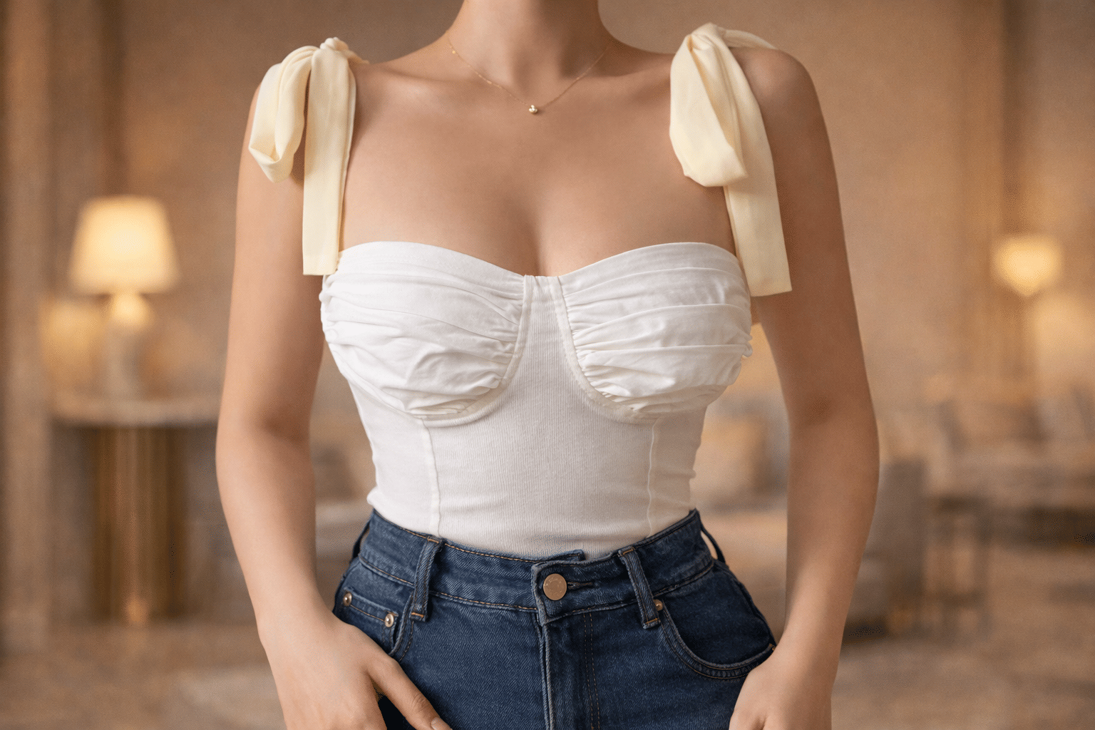 The white-colored polyester top is in a corset style, with a sweetheart neck and shoulder straps. You can style it with trousers or pants to give yourself a chic and elegant look and add a pair of heels with a bag and put on a bold lip combo to complement the whole look.