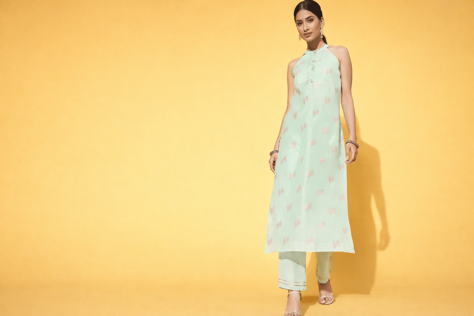 The two-piece set is an ethnic motif kurta set in a green shade. The fit is made up of poly chanderi. It has a halter neck with a sleeveless design. It is calf length and has a trouser. In all the Western times for Valentine, you give a try to something refreshing like this. You can pair it with heels and add statement pieces to get the perfect look.
