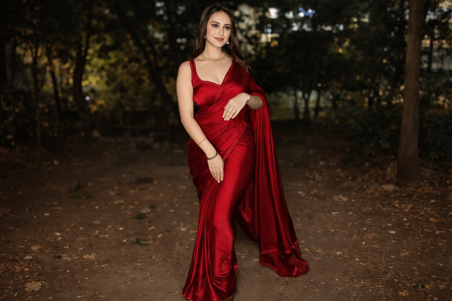 The last outfit suggestion is a red organza saree with an embroidered border. It comes with an unstitched blouse piece, which you can get stitched according to your own preference. You can pair it with stone jewellery and heels or a jutti for that effortless look.