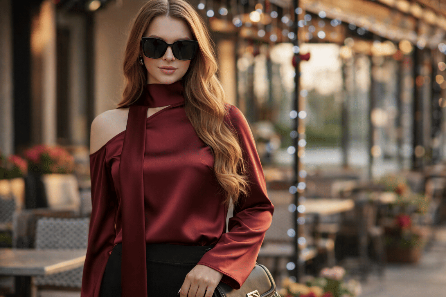 The piece is a wine-coloured one-shoulder top, and the other sleeve is long and regular with a tie-up design at the neck. The top is made from satin material and is opaque. It is a perfect choice for Valentine’s; pair it with black shorts, add a sling bag, and heels. A red lip will go perfectly with it.